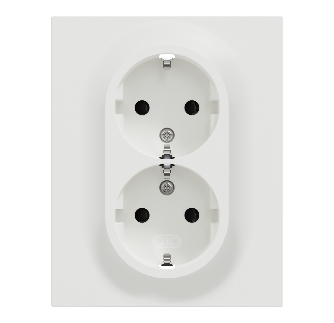 ELKO One lav dobbel stikkontakt med hurtigklemme av fargebestandig materiale i renhvit (RAL9003). Den er jordet, innfelt og med hel dekkplate og barnevern.