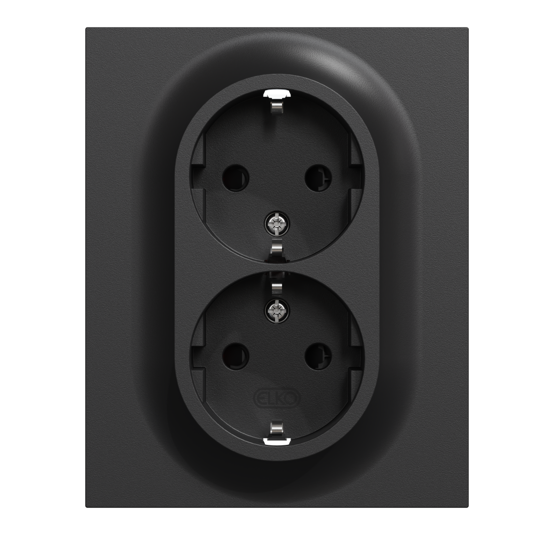 ELKO One lav dobbel stikkontakt med hurtigklemme av fargebestandig materiale i sort (RAL9005). Den er jordet, innfelt og med hel dekkplate og barnevern.