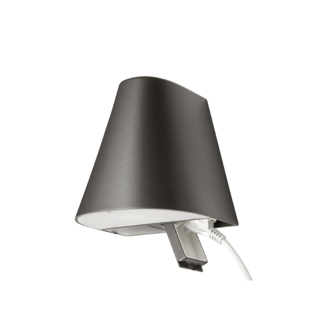 Moderne veggarmatur for utendørs montering produsert i trykkstøpt, pulverlakkert i grafitt overflate. Skjerm i UV-stabilisert, opal polykarbonat. Armaturen har integrert LED-lyskilde med 95 graders lysspredning (nedlys). Versjon med kun nedlys og stikkontakt skjult bak vippelokk. Dimbar med faseavsnittdimmer. Vi anbefaler LEDDim400 og LEDDim Smart. Beskyttelsesklasse IP44.