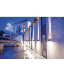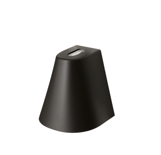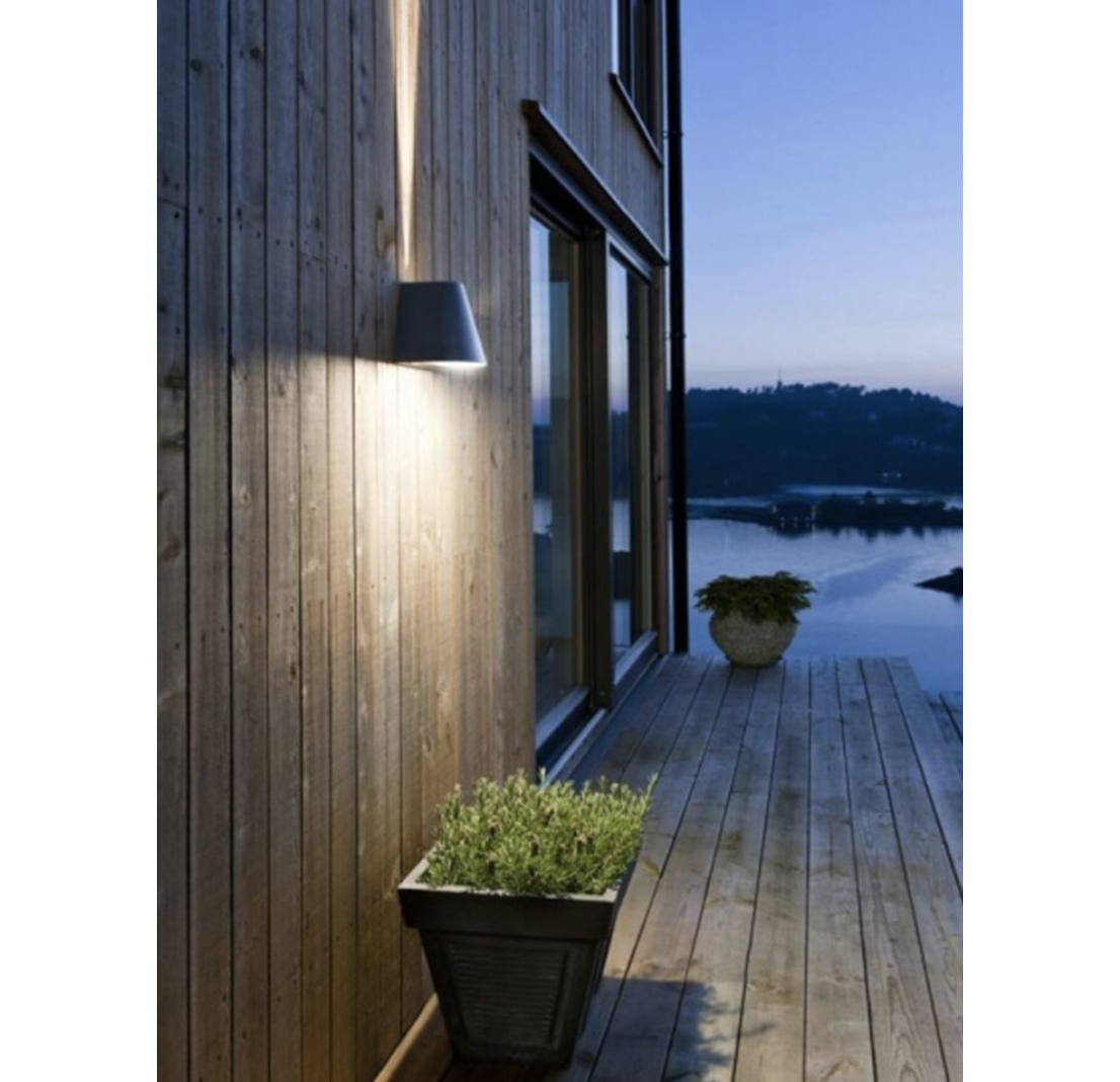 Moderne veggarmatur for utendørs montering produsert i trykkstøpt, pulverlakkert i sort overflate. Skjerm i UV-stabilisert, opal polykarbonat. Armaturen har integrert LED-lyskilde med 95 graders lysspredning (nedlys) og opplys. Armaturen har automatisk skumringsrelé. Beskyttelsesklasse IP44