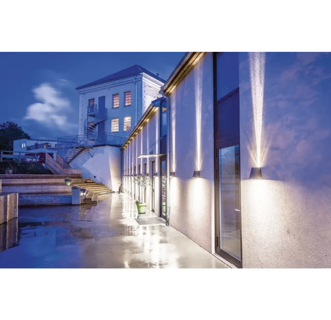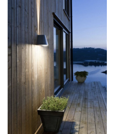 Moderne veggarmatur for utendørs montering produsert i trykkstøpt, pulverlakkert i sort overflate. Skjerm i UV-stabilisert, opal polykarbonat. Armaturen har integrert LED-lyskilde med 95 graders lysspredning (nedlys) og opplys. Beskyttelsesklasse IP44